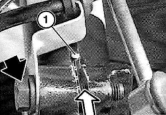 Insert positioning pin (1) into gap and press steering knuckle upwards onto stop.