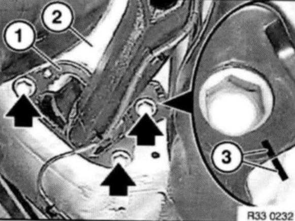 Mark position of bearing pedestal (1) to body (2) with colored mark (3); this simplifies subsequent toe-in adjustment.