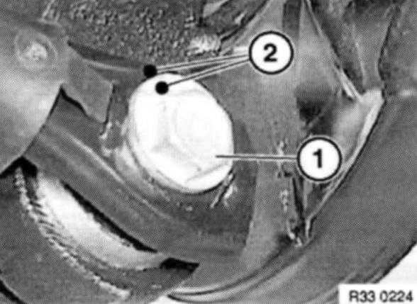 Mark position of eccentric bolt (1) to control arm with center marks (2); this simplifies subsequent camber adjustment.
