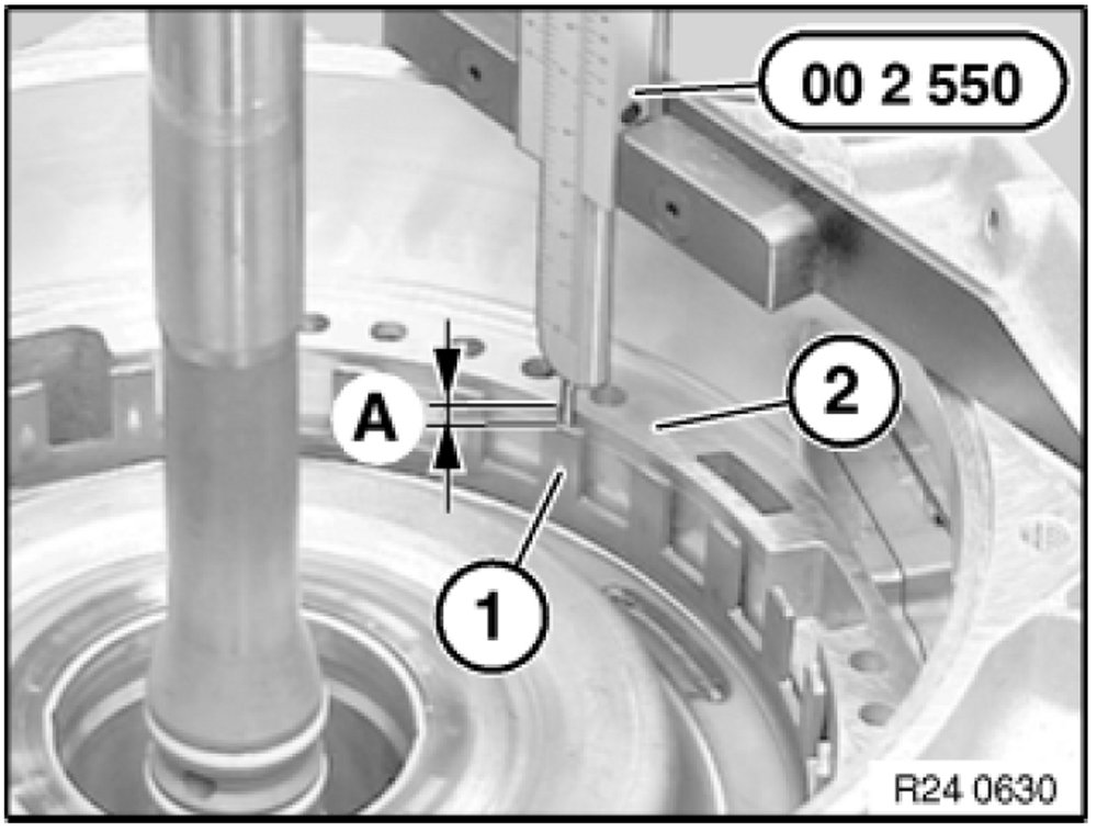 - Before fitting new converter bell housing, check measurement "A" between transmission housing (2) and pulse gear (1) with special tool 00 2 550.