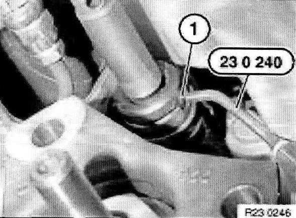 Drive out retaining pin (1) on selector rod linkage with special tool 23 0 240.