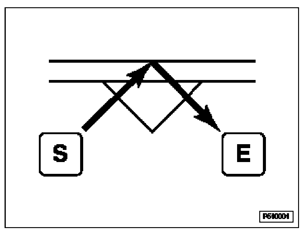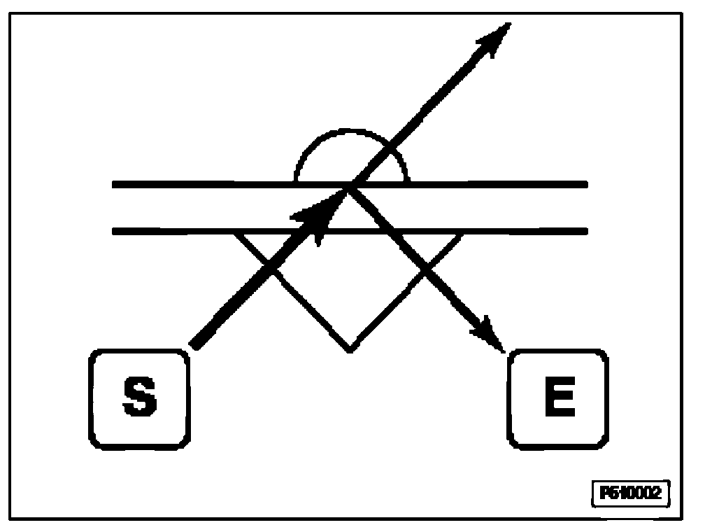 When the windshield is dry, all infrared beams which are emitted by the infrared diodes "S" and which hit the windshield at a defined angle are reflected in full by the windshield and therefore reach the infrared receivers "E" also in full.