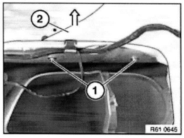 Release screws (1) and remove water reservoir for windshield washer system (2) in direction of arrow.