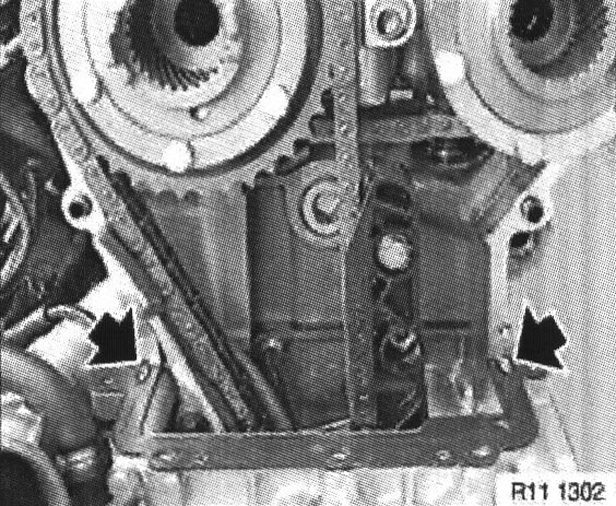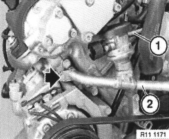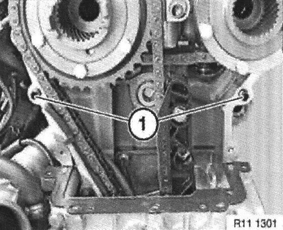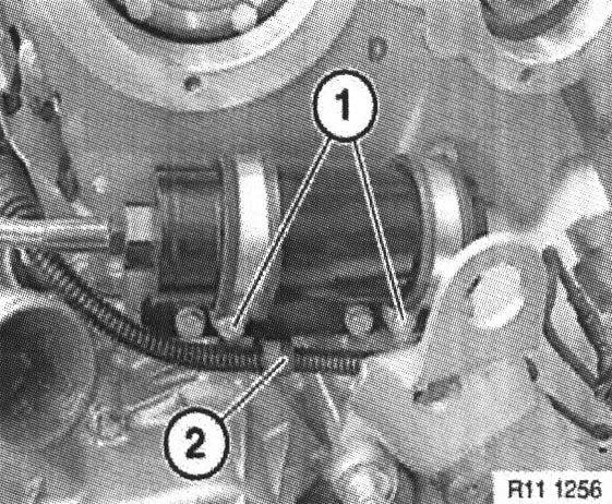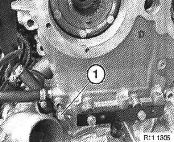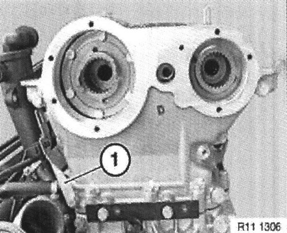 Note: It is not possible to insert screw (1) after fitting the timing case cover.
