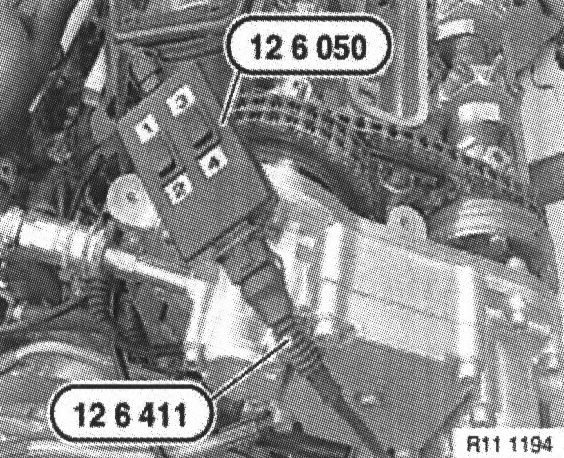 Connect special tool 12 6 050 in conjunction with special tool 12 6 411 (from special tool kit 12 6 410) to solenoid valves on cylinder bank 5 to 8. Connect special tool 12 6 411 to correct terminals on car battery.