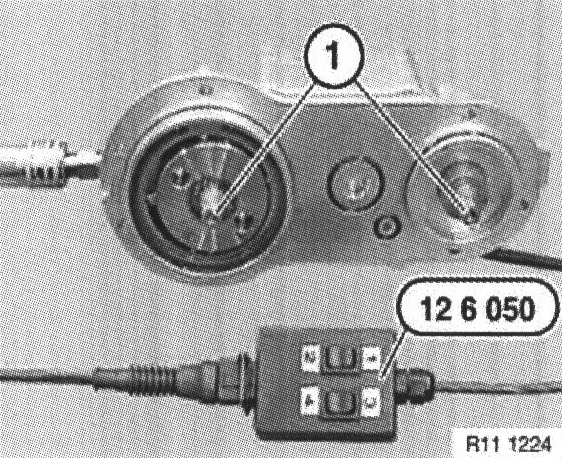 Connect special tool 12 6 050 in conjunction with special tool 12 6 411 (from special tool kit 12 6 410) to solenoid valves on cylinder bank 1 to 4. Connect special tool 12 6 411 to correct terminals on car battery.