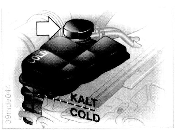 WARNING! Wait until the engine cools before removing the cap from the expansion tank. The needle of the coolant gauge in the instrument cluster must be located in the blue zone; otherwise, there is a danger of scalding.