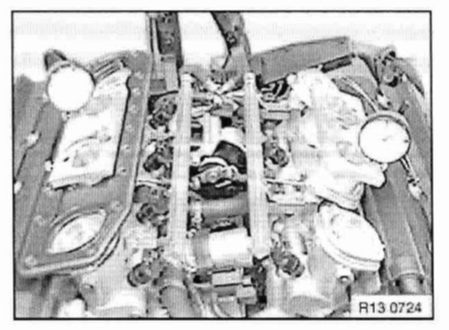 Position dial gauge plates on throttle body of cylinders 2 and 3 and throttle body of cylinders 6 and 7. Mount dial gauges with inserted extension pins in dial gauge plate supports for measuring at throttle bodies 3 and 6.