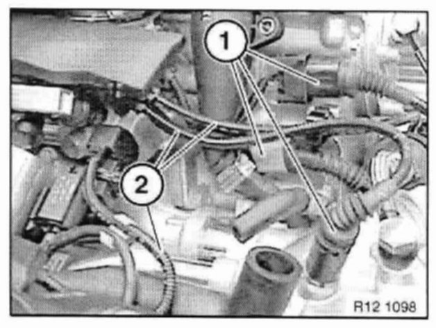 Disconnect plug connection (1) on throttle actuator. Unhook cable duct (2) from mounts and raise approx. 2 cm.