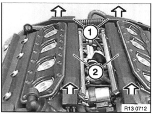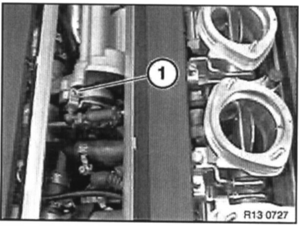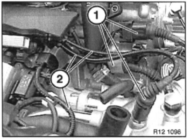 Unclip both cable strips (2) from fuel injectors, tilt up and tie back (e.g. to engine hood).