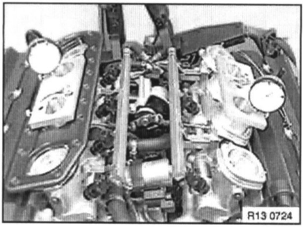 Position dial gauge plates on throttle body of cylinders 2 and 3 and throttle body of cylinders 6 and 7. Mount dial gauges in dial gauge plate supports for measuring at throttle bodies 3 and 6.