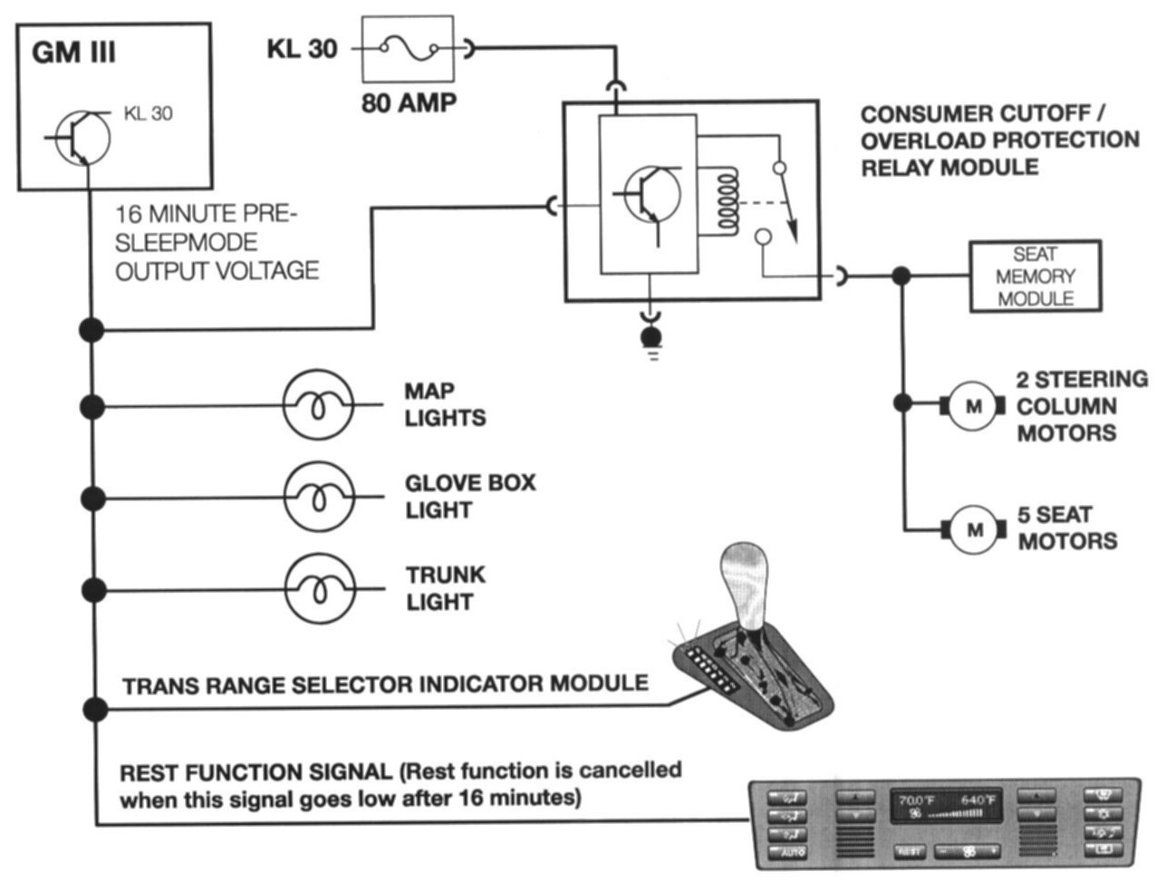 The seat and steering column motors are provided operating power through the consumer cutoff I overload protection relay module as on the E38. The consumer cutoff signal from the GM signals the relay to maintain operating power to the consumers.