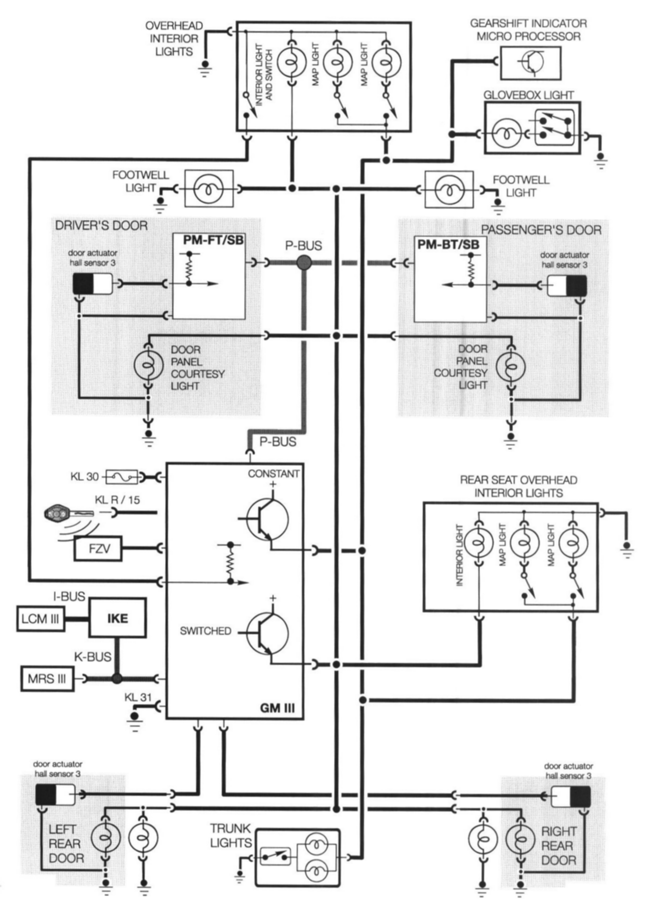 The GM controls the interior lighting automatically with the status change of several monitored inputs. The lighting can also be manually controlled using the interior light switch.