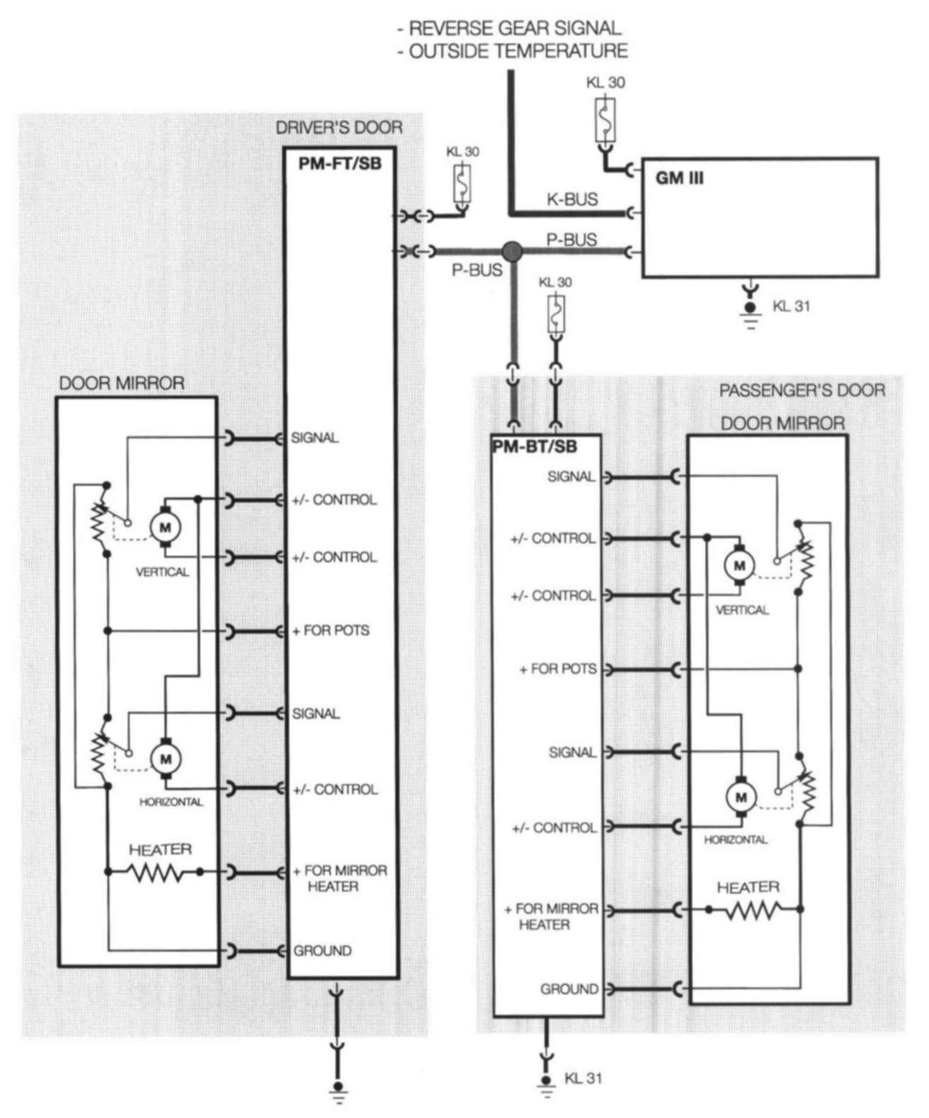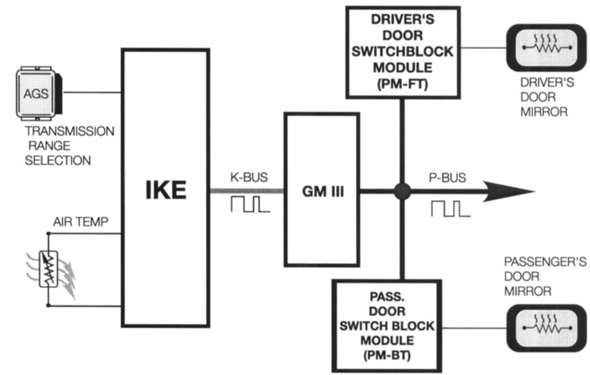 The output stages and memory storage of mirror positions is handled by the respective door modules. The positioning of the mirrors is signaled from the driver's door switch block/module. The signal passes over the P-Bus to the passenger's door module.