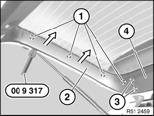 Using special tool 00 9 317, lever out side trim (1) on left/right with clip (2) from retainer (3) in lower trim (4).