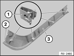 With special tool 00 9 317, unclip clips (1) in side trim (2).