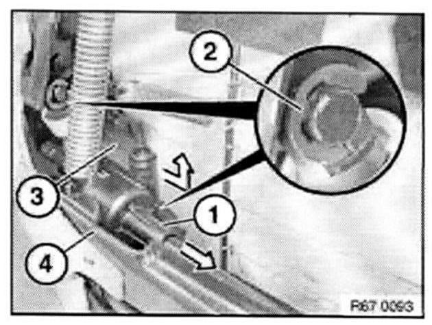 Detach shaft (1) in direction of arrow from drive unit for head restraint adjustment (3).