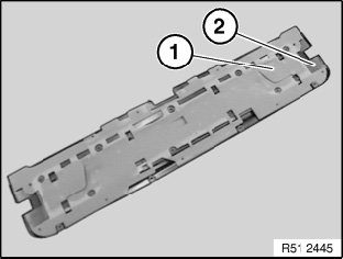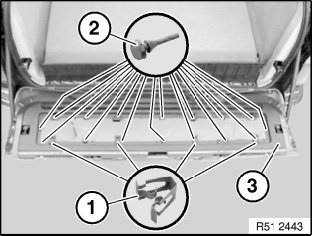 If necessary, replace faulty retainers (1) and rubber parts (2) on rear lid lower section (3).