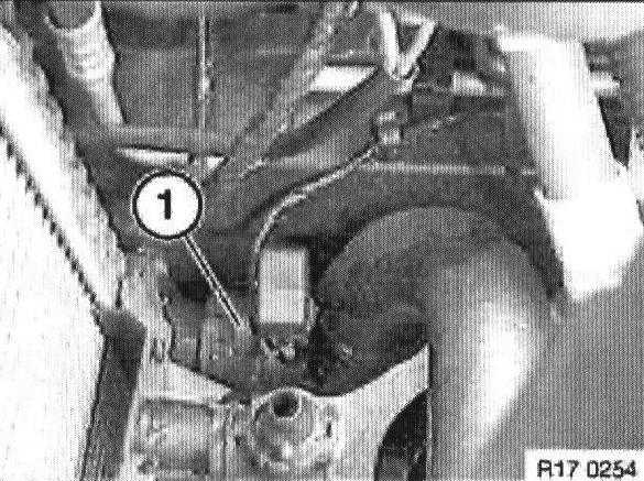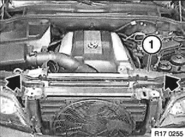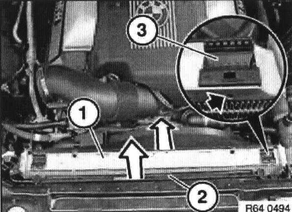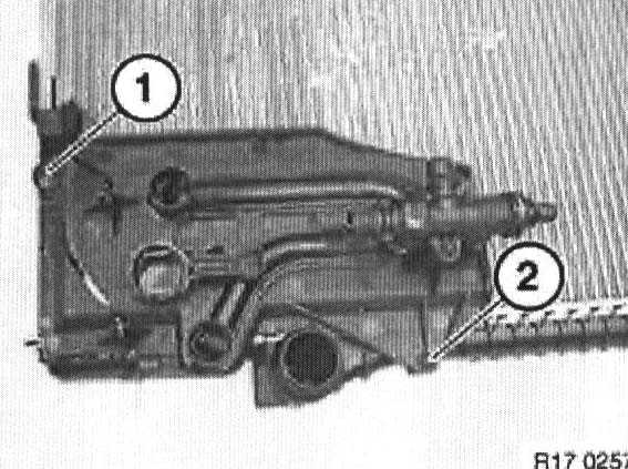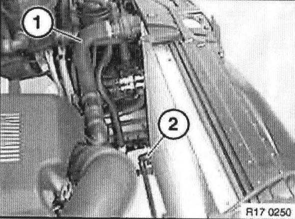Detach water hose (1) from radiator at top.
