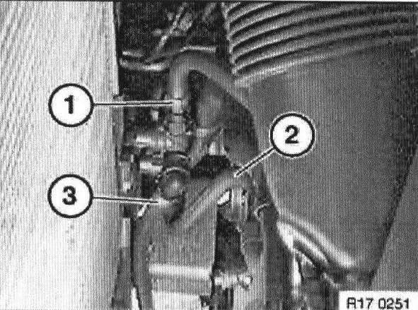 Detach water hose (1) from radiator at bottom.