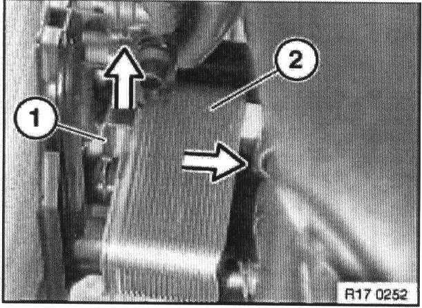 Remove heat exchanger (2) for automatic transmission fluid from mounting plate on radiator.