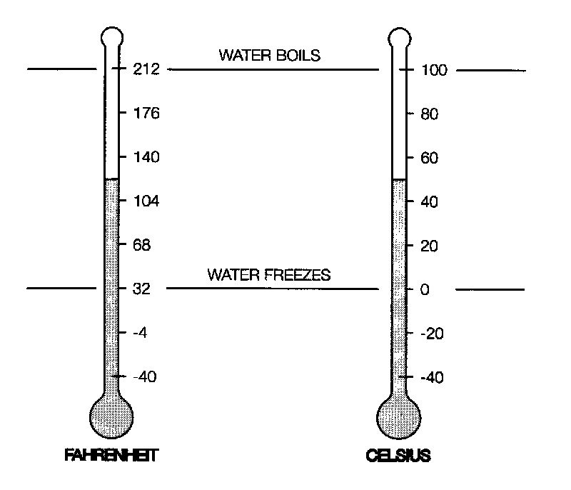 The amount of heat energy present is measured as the temperature. There are two different temperature scales, Fahrenheit and Celsius.