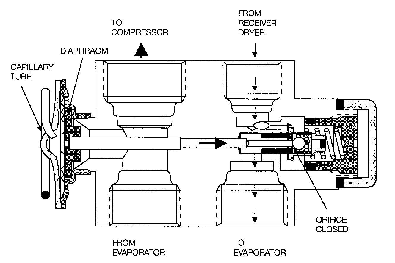 A block-valve design of expansion valve is used on current BMW A/C systems. The refrigerant enters at the upper right inlet. At the left of the valve there is a capillary tube filled with an inert gas, that senses the temperature of the air coming into the housing from the plenum. When the air temperature in the plenum rises, the pressure in the capillary tube increases. This pushes down on a diaphragm and pushrod assembly, which increases the size of the orifice opening, allowing more refrigerant into the evaporator and providing more cooling. When plenum temperature falls, the pressure in the capillary tube falls. The spring pushes up on the pushrod, making the orifice opening smaller; less refrigerant is allowed into the evaporator, allowing less cooling.