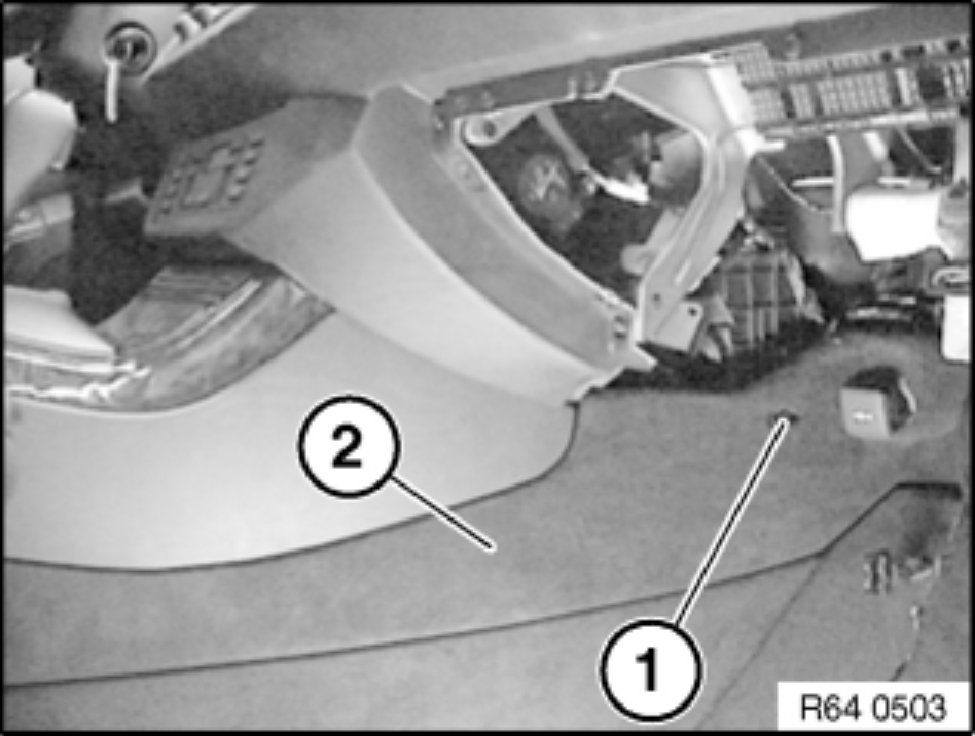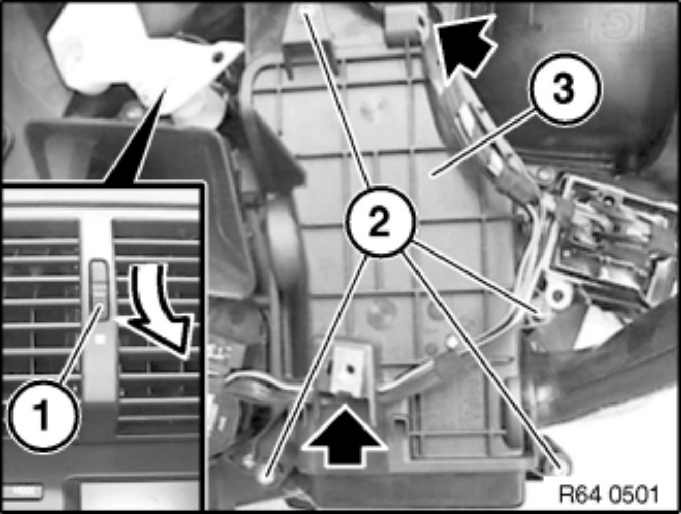Unclip heating duct for right footwell (2) and remove in direction of arrow.