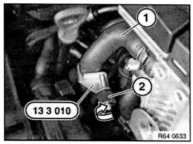 Fit special tool 13 3 010 as illustrated to water hose (1).