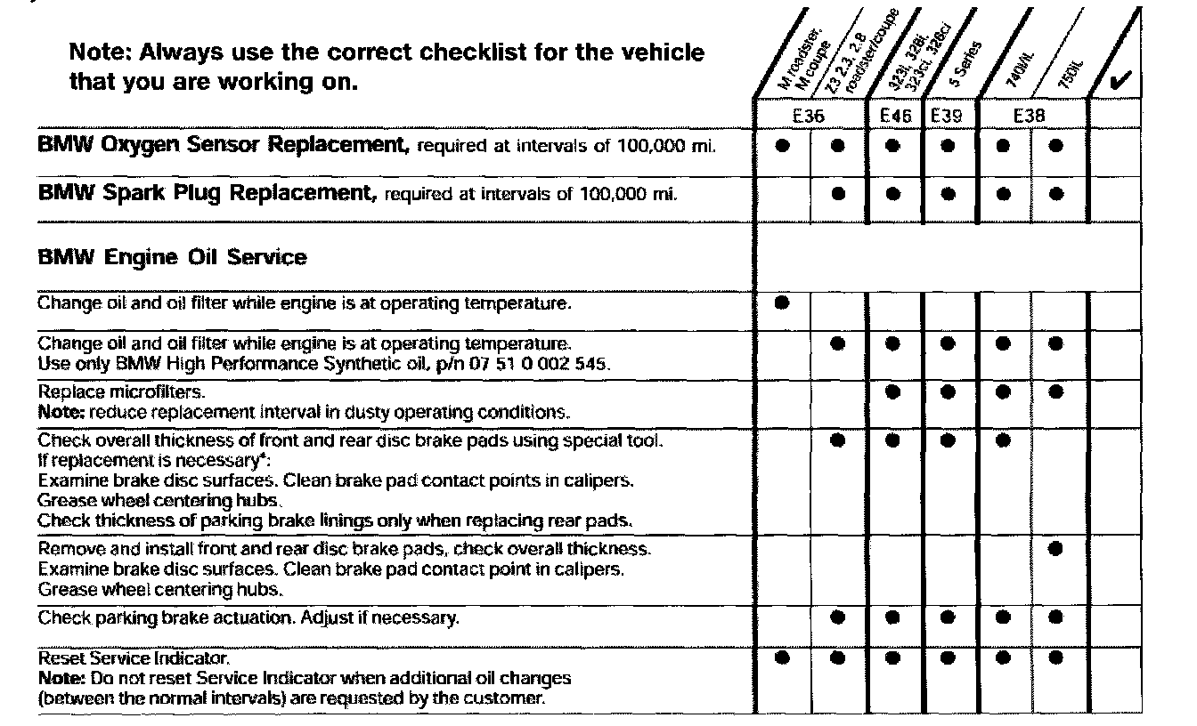 The BMW Oil Service includes other comprehensive vehicle checks and maintenance because the service intervals are further apart. Refer to the Service Maintenance Checklist for the exact procedure for the vehicle that is being serviced as contents of the service do vary.
