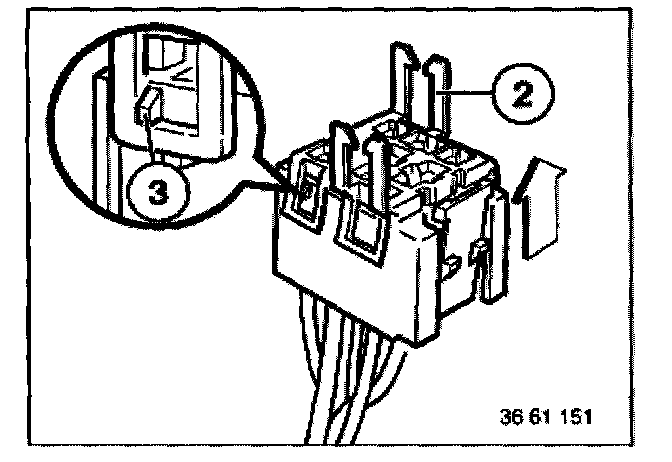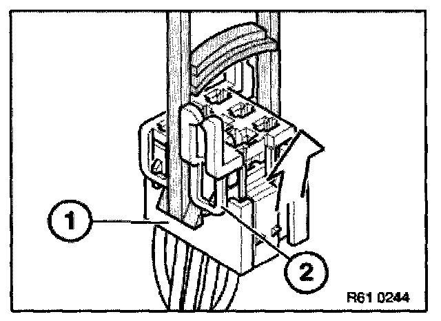 Place special tool 61 1 153 on relay carrier (1) and carefully pull in direction of arrow until retaining lugs (2) on relay carrier are raised.