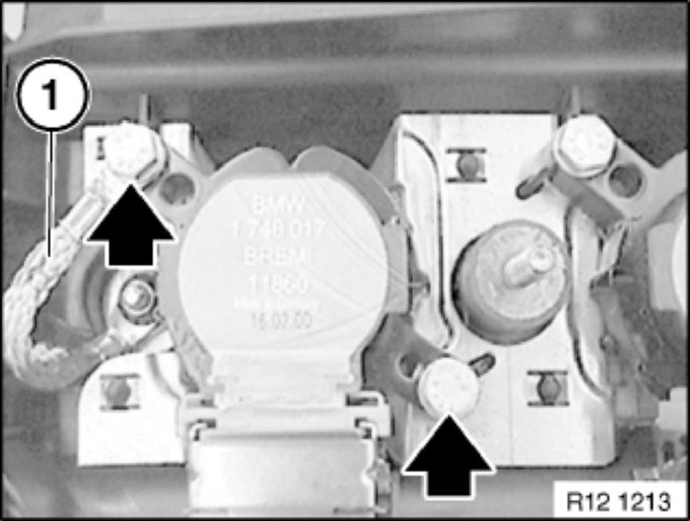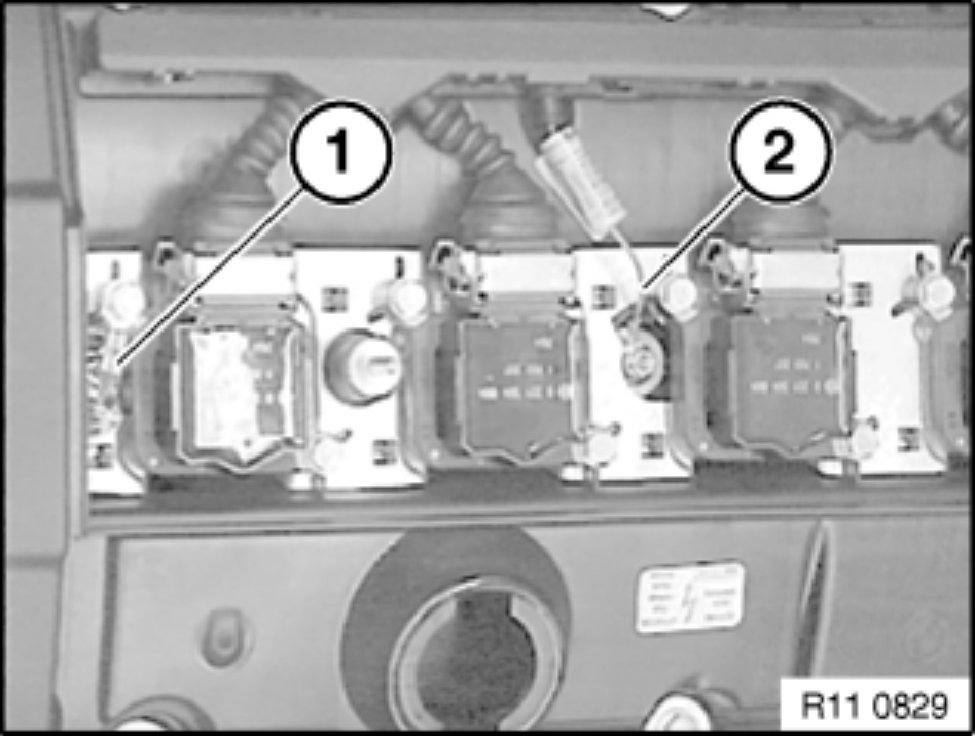 Screw down grounding strap (1) of cable duct with connecting plate (2) of ignition coils.