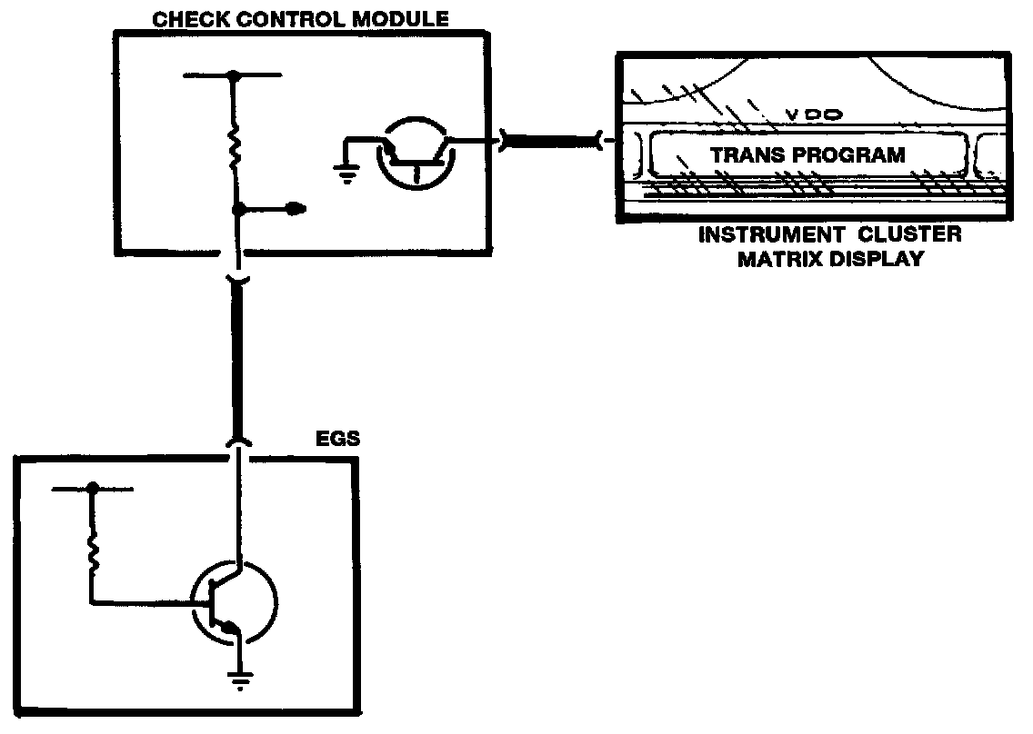 The check control module produces a voltage that is pulsed (low) by the TCM during normal operation. With a fault detected by the self-diagnostic feature of the control module, a fault report is signalled to the check control module by a constant high voltage level. The report is delivered to the instrument cluster which activates the "TRANS PROGRAM" display.