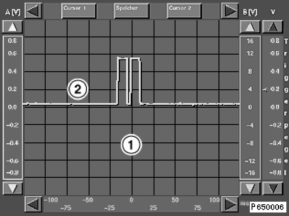 The 4-pin adapter lead 61 6 032 must be used for the measurement. The adapter lead must be attached to the connector on the seat belt buckle and the wiring harness. The multifunction cable MFK1 is connected to the adapter pin 1 (terminal 31) and adapter pin 3 (cable to MRS control module). The oscilloscope is set by the test module.