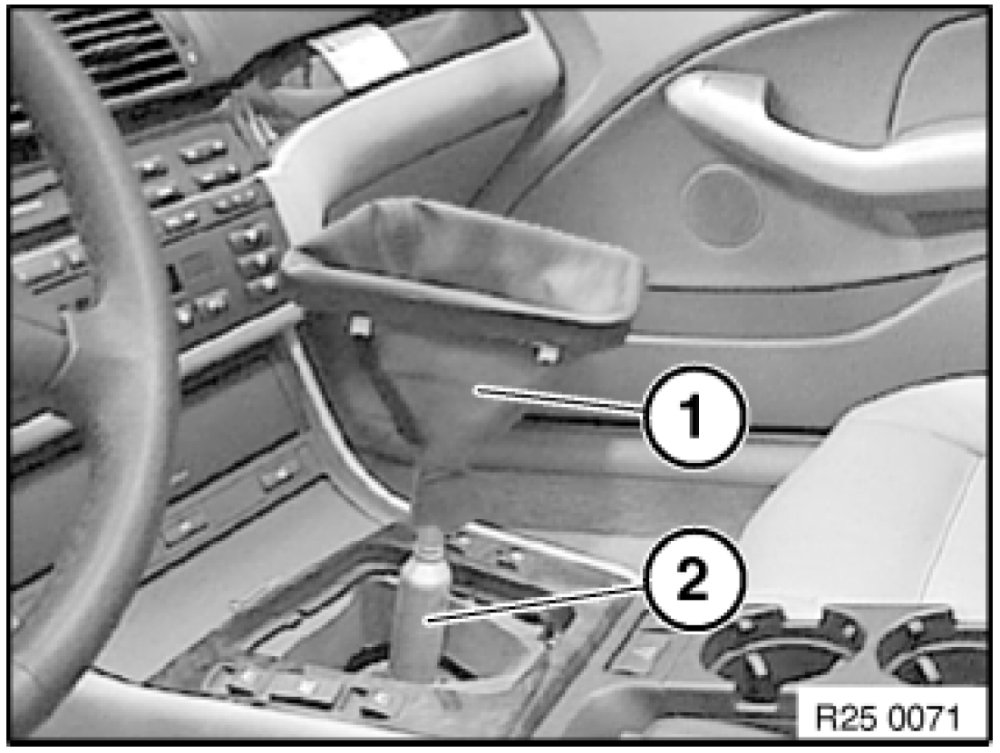 Push rubber gaiter (1) down and attach to selector lever (2).