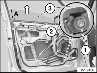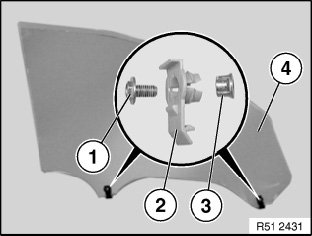 If necessary, fit new screws (1) and nuts (3) on door window glass (4).