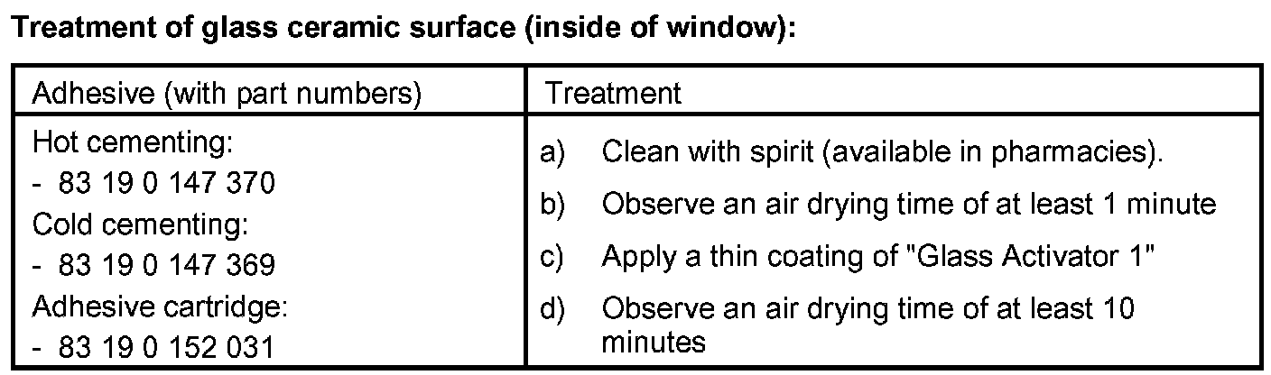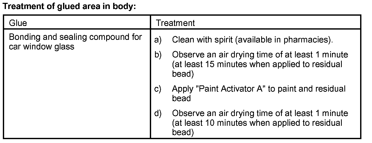 The windscreen and rear window (also the rear side windows if necessary) are bonded to the body. This gluing will increase the torsional strength of the vehicle. To obtain perfect bonding, comply with the installation procedure described in the following.