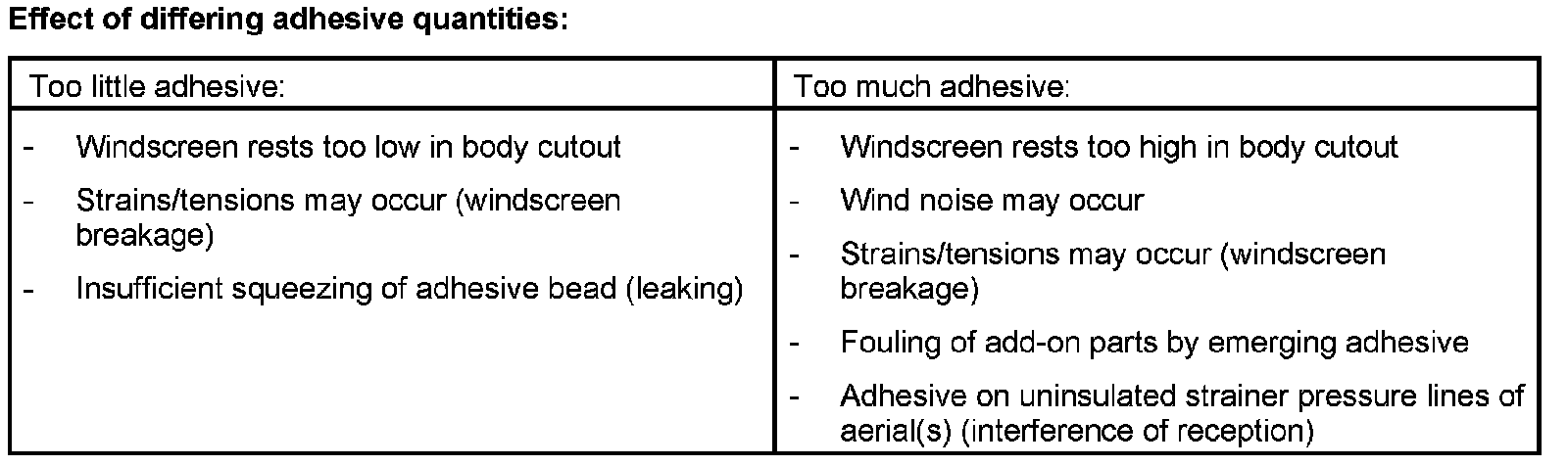 Approx. 1 1/4 adhesive cartridges are required to cement the windscreen on the following vehicles: