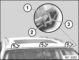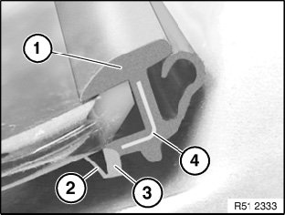 Cut through tear-off lip (2) on new rubber frame (1). If adhesive has reached rib (3) through tear-off lip (2), this area must be cut out partially.