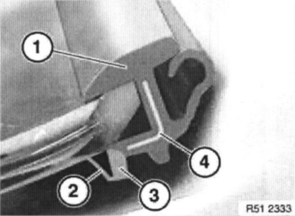 Cut through tear-off lip (2) on new rubber frame (1). If adhesive has reached rib (3) through tear-off lip (2), this area must be cut out partially.