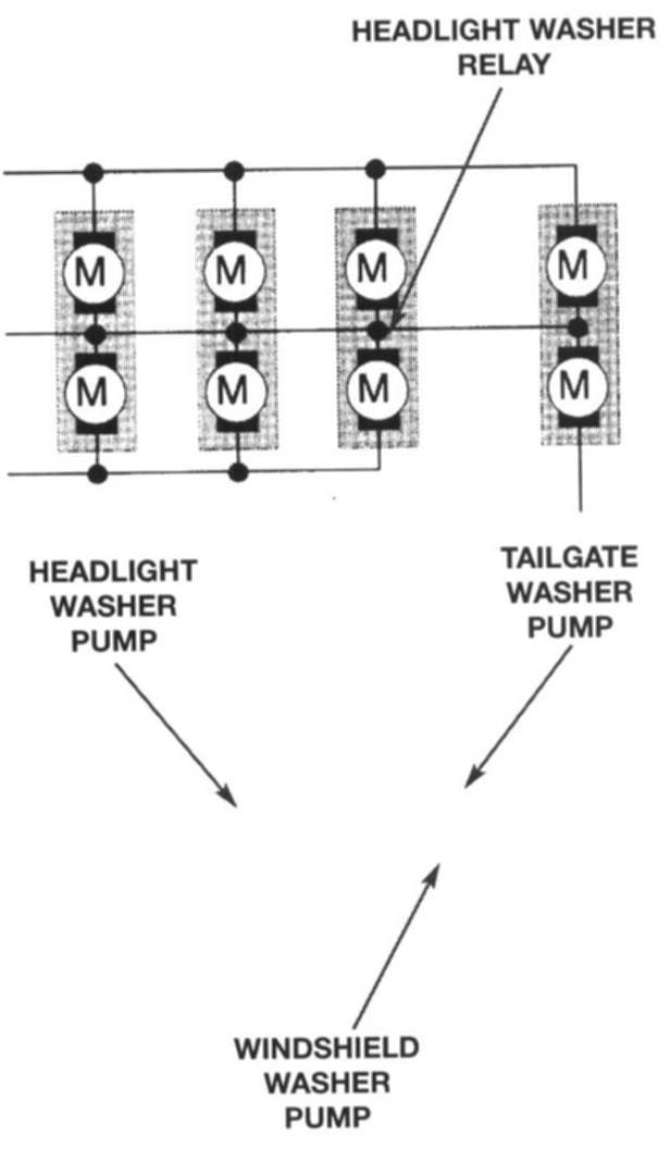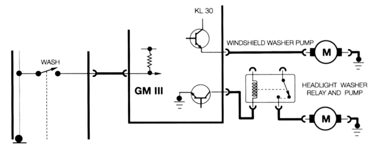 Pulling the Windshield Wiper Switch rearward closes the "wash" contact providing a switched ground input to the GM. The GM activates the windshield washer pump directly via a power output final stage transistor.