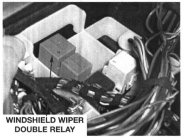 - Output control of the wiper motor is through the windshield wiper double contact relay. The relay is located in the engine compartment E-box and is tan in color.