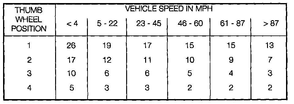 WIPER TIME DELAYS (SECONDS) BASED ON SET POSITIONS 1 - 4