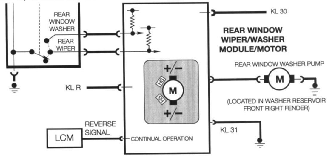 When the transmission is shifted into reverse, the wiper will switch to continuous operation until the vehicle is shifted out of reverse. This high signal is provided by the LCM III when it activates the back up lights.
