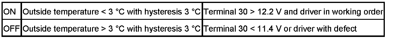With terminal 15 ON, the spray nozzle heating is switched on and off based on the outside temperature transmitted via the K-bus. in order to prevent the spray nozzles freezing up dependent on the outside temperature. A control unit activates and monitors the spray nozzles.