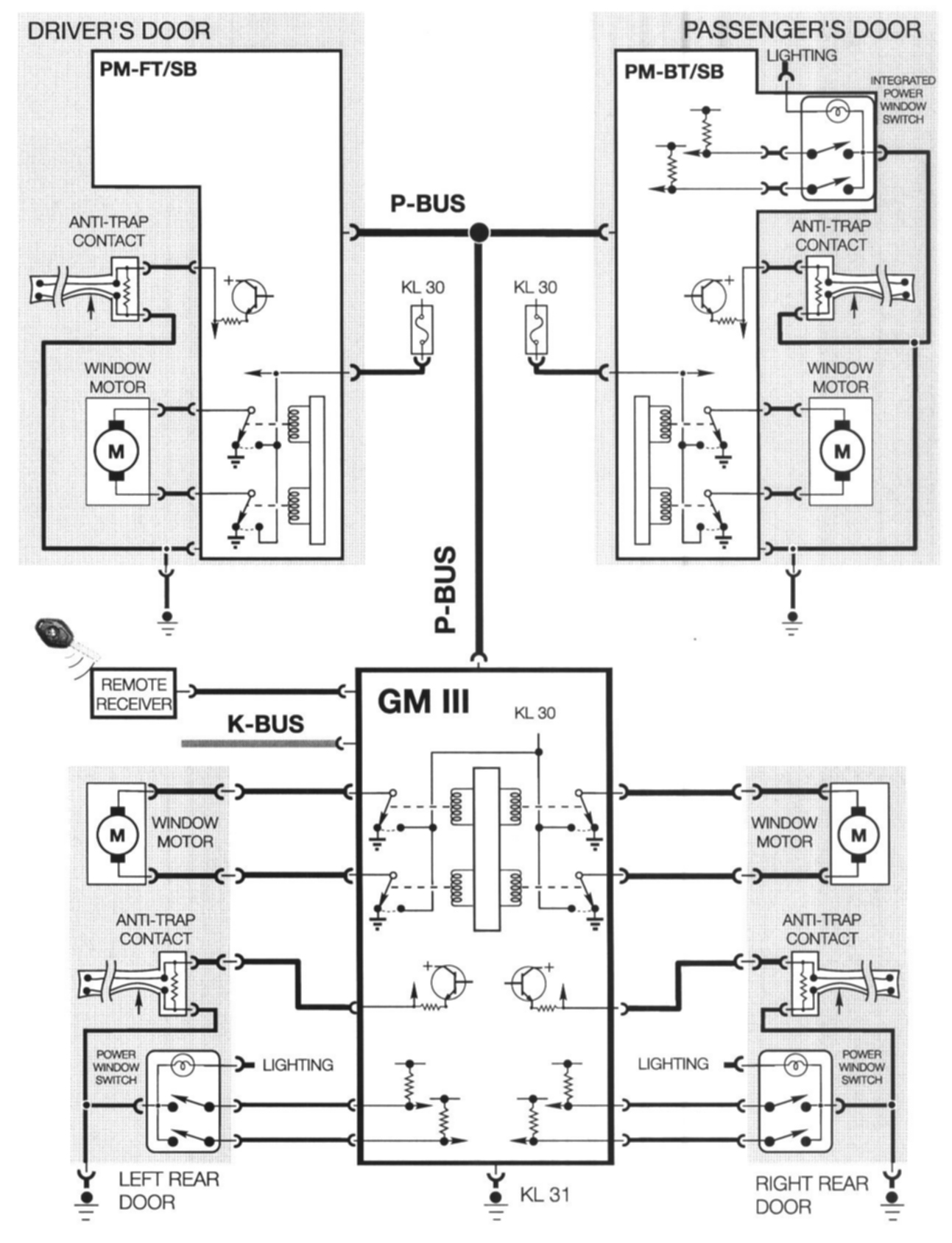 - Control of the front and rear door window motors is carried out directly by the GM.