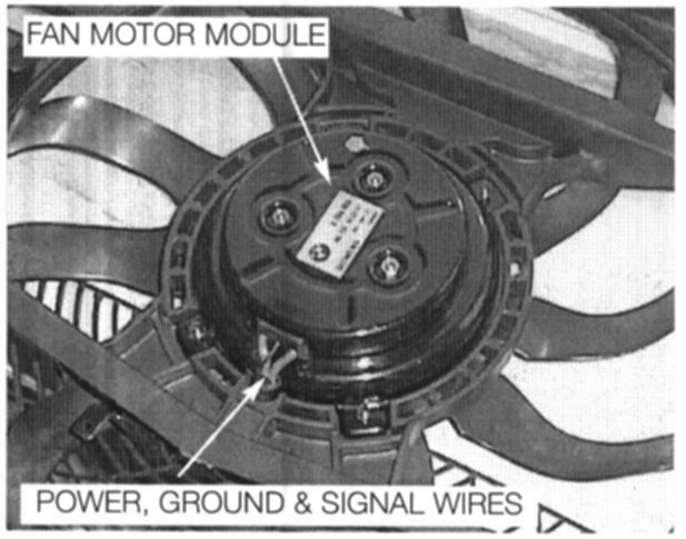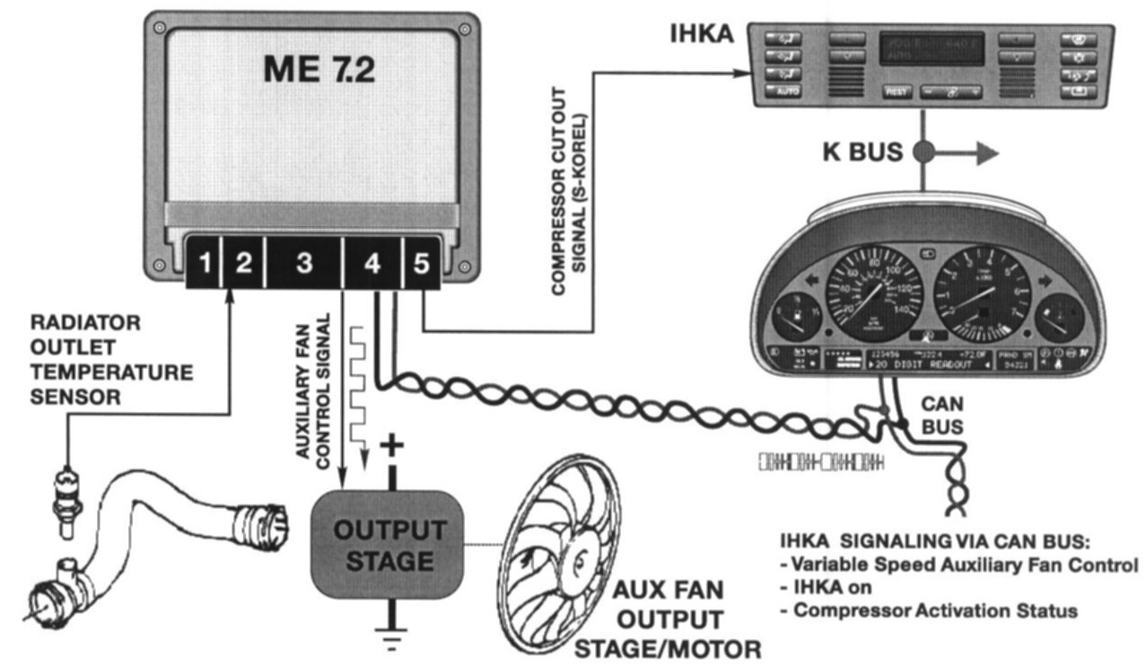 The auxiliary fan is controlled by ME 7.2. The motor output stage receives power and ground and activates the motor based on a PWM signal (10 - 100 Hz) received from the ME 7.2.