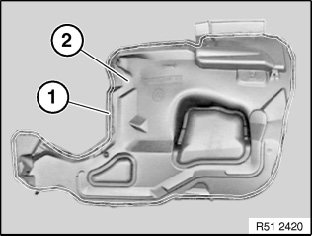 Using special tool 00 9 317 (trim panel wedge), lever out sealing bead (1) of sound insulation (2) completely or if necessary partially.