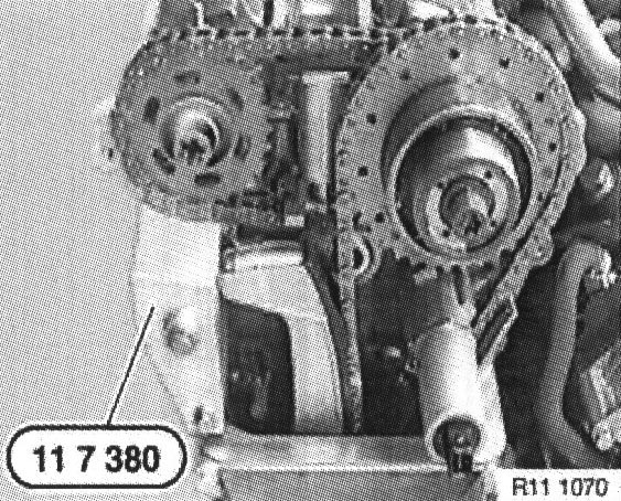 Pretension tensioning rail by turning adjusting screw on special tool 11 4 230 with special tool 00 9 250 to 0.7 Nm