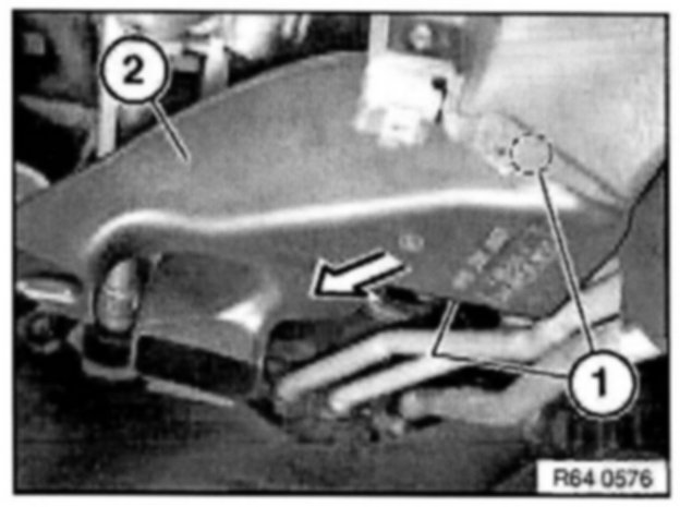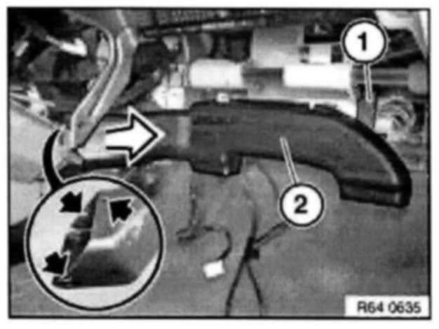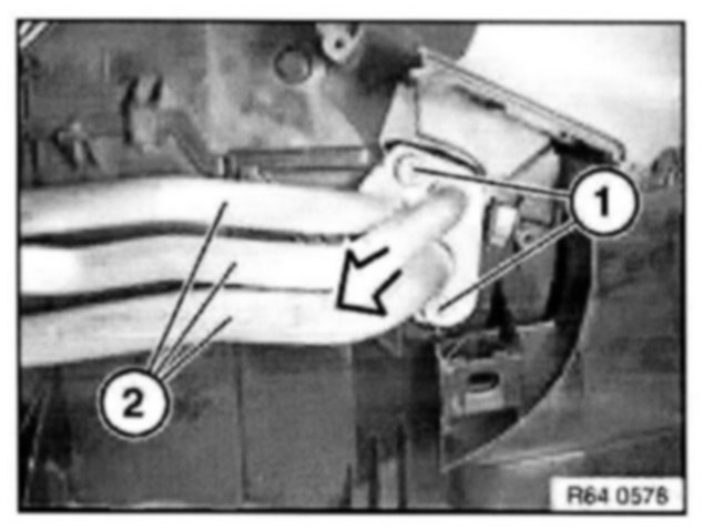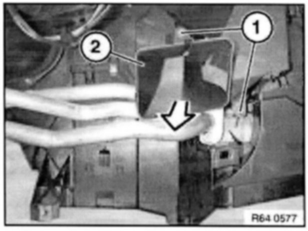 Unclip air duct for left footwell (2) at mountings (1) and remove in direction of arrow.